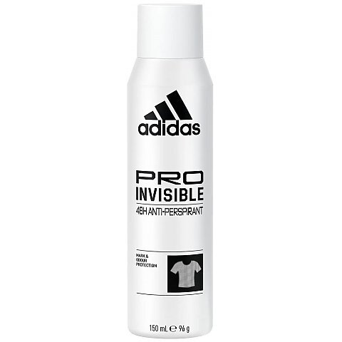 Adidas Pro Invisible Woman - antyperspirant w sprayu adidas PRO Invisible zapewnia 48-godzinną ochronę przed wilgocią i nieprzyjemnym zapachem. Formuła zapobiega powstawaniu białych i żółtych plam, chroniąc nawet czarne i białe ubrania. Kompozycja łączy świeży, subtelny aromat z pudrowo-kwiatowymi akordami. Formuła została przebadana dermatologicznie, jest wegańska i nie zawiera alkoholu.
