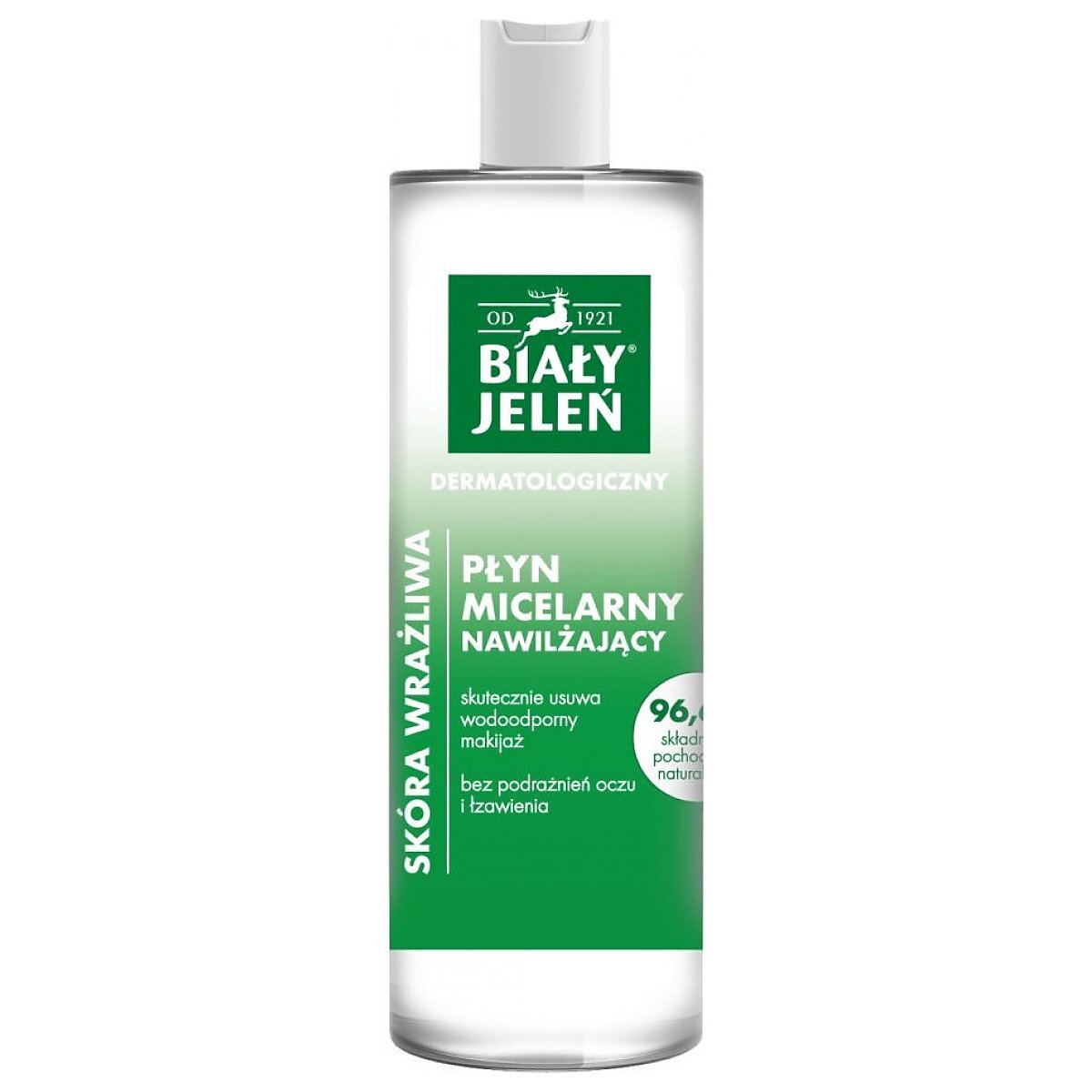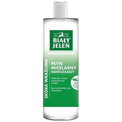 Biały Jeleń - dermatologiczny płyn micelarny. Posiada łagodną formulę oczyszczającą, zapewnia uczucie odświeżenia, nie szczypie w oczy. Jest odpowiedni dla osób noszących soczewki kontaktowe