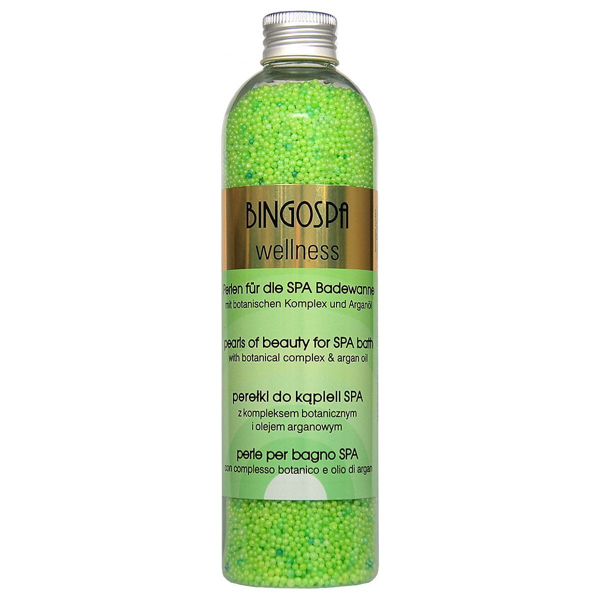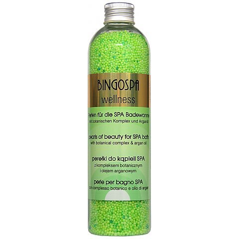 BingoSpa - perełki do kąpieli z kompleksem botanicznym i olejem arganowym. Perełki do kąpieli SPA to molekuły głęboko nawilżającej substancji, nasycone olejkiem arganowym i ekstraktami roślinnymi, które pomagają zachować elastyczność, sprężystość i miękkość skóry. Molekuły o średnicy ok. 1mm, pod wpływem wody stopniowo uwalniają składniki pielęgnacyjne, równomiernie nasycając skórę przez cały czas trwania kąpieli.