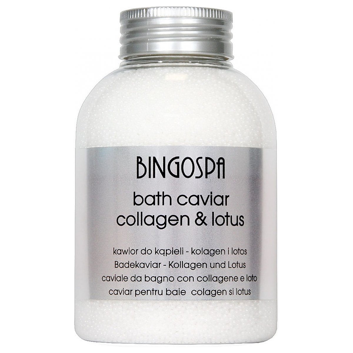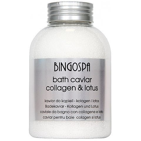 BingoSpa - kawior do kąpieli z olejkiem z różowego lotosu i kolagenem to molekuły silnie nawilżającej substancji, nasycone rozpuszczalnym kolagenem. Molekuły o średnicy ok. 1mm, pod wpływem wody stopniowo uwalniają składniki pielęgnacyjne, nasycając skórę przez cały czas trwania kąpieli. Odpowiada za odpowiedni stopień nawilżenia skóry i chroni ją przed utratą wody transepidermalnej. Nawilżający kawior pomaga osiągnąć właściwy stopień nawodnienia skóry i jej zdolności wchłaniania. Po kąpieli skóra jest gładka, jedwabiście połyskująca i relaksująco pachnąca.