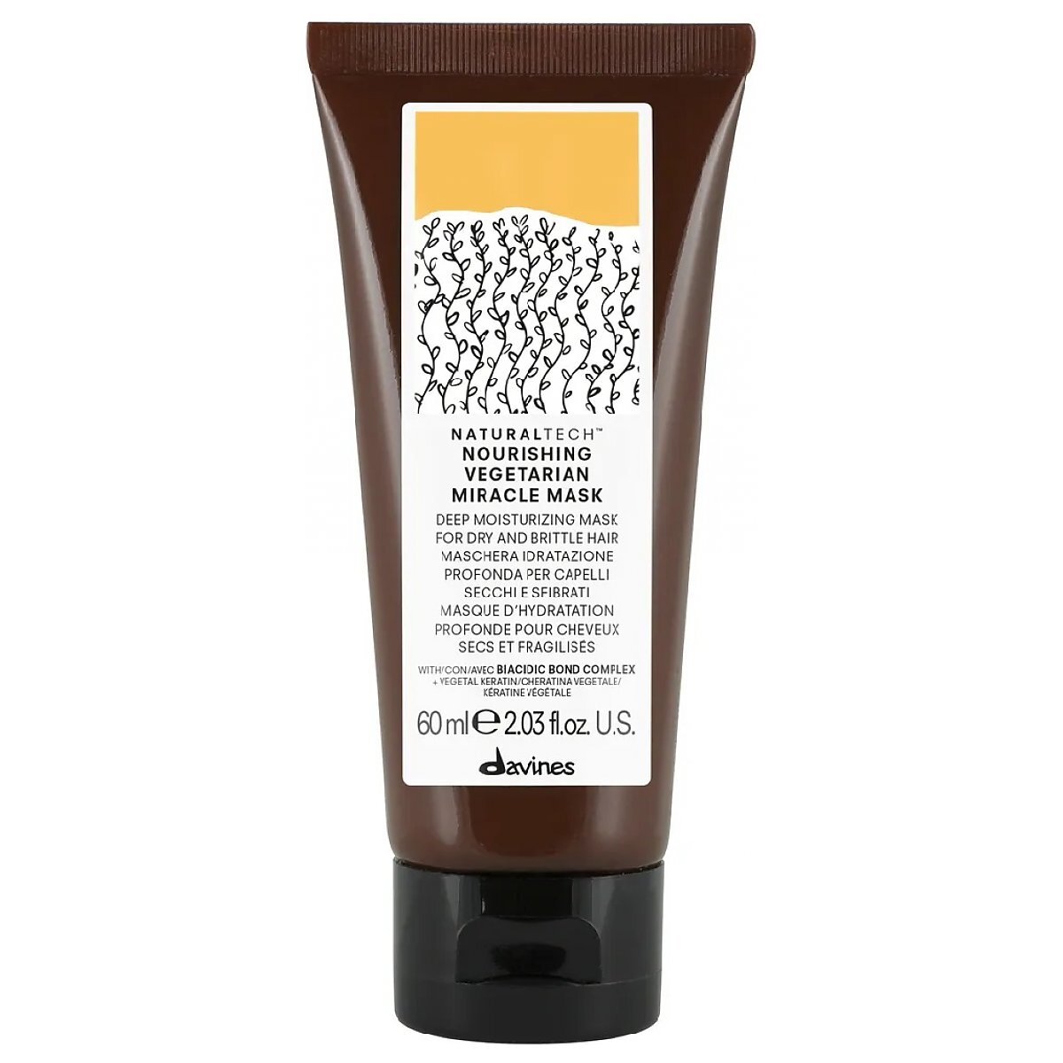 Davines Naturaltech Nourishing Vegetarian Miracle Mask - maska przeznaczona do pielęgnacji włosów suchych i osłabionych, grubych i niezdyscyplinowanych. Odżywia i intensywnie nawilża włosy, pozostawiając je miękkie i lśniące. Formuła wzbogacona keratyną roślinną pochodzącą z ryżu, która w połączeniu z aminokwasami i kompleksem Biacidic Bond Complex, stworzonym przez zespół badawczy Davines, sprawia, że włosy natychmiast stają się lśniące i łatwe w układania. Uszczelnia łuski włosów, zapewniając natychmiastowe i długotrwałe rezultaty.