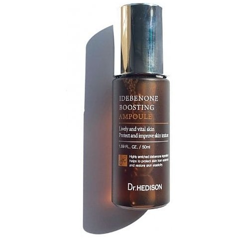 Dr. Hedison Idebenone Boosting Ampoule - ampułka przeciwstarzeniowa zawierająca idebenon, czyli ekskluzywny składnik przeznaczony do walki ze zmarszczkami. Skutecznie poprawia jędrność i elastyczność skóry. Jest również jednym z najsilniejszych antyoksydantów, który ogranicza powstawanie wolnych rodników. Wspomaga odnowę uszkodzeń skóry i wzmacnia jej barierę ochronną