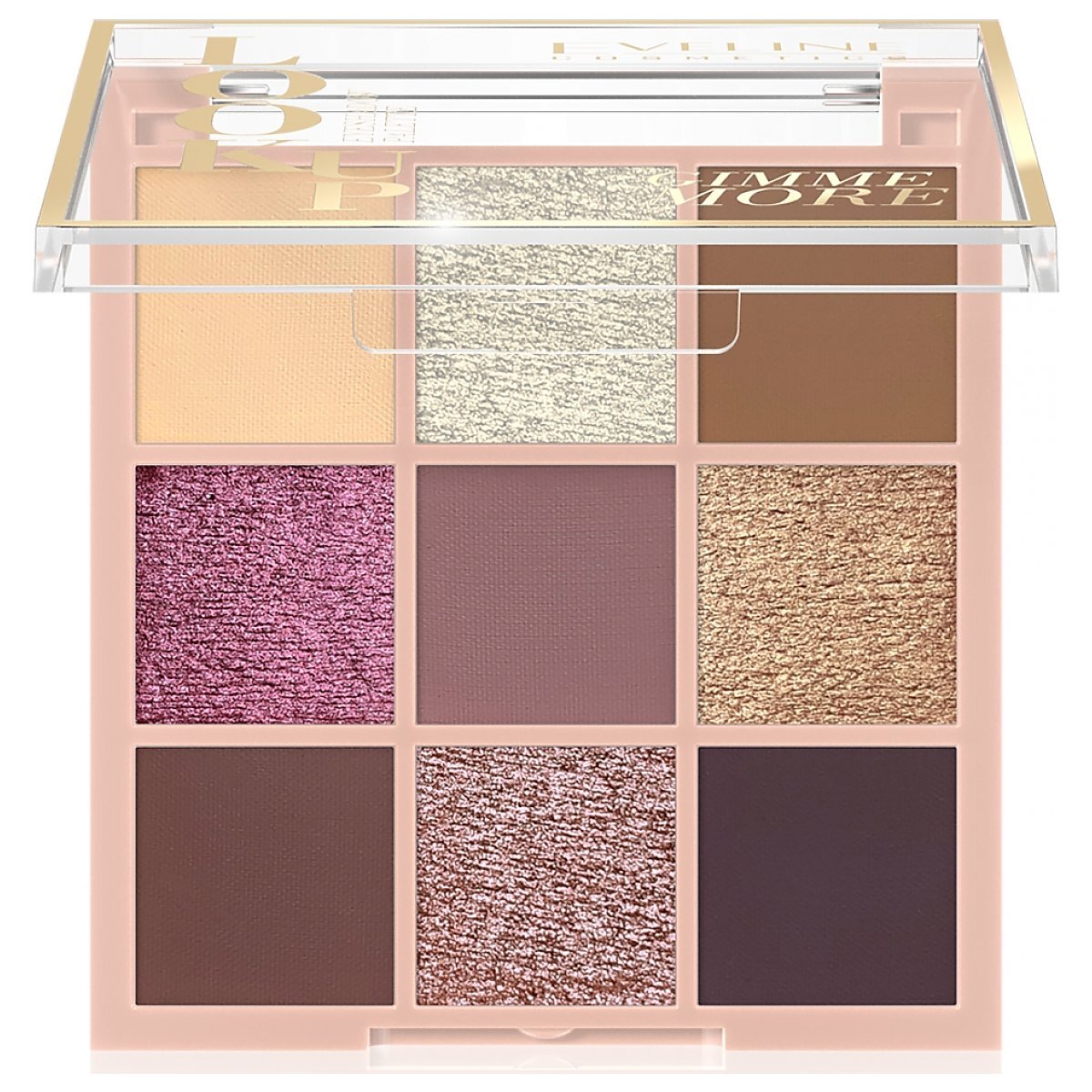 Eveline Cosmetics Look Up - paleta 9 cieni zadba o wyjątkowe charakteryzacje na wiele niezwykłych okazji! Mieszanka złota, beżów i fioletów z różami wyczaruje piękne makijaże, w których możesz występować na luźnych spotkaniach towarzyskich, jak i na oficjalnych zebraniach. Wegańskie, prasowane cienie sprawią, że budowanie kolorów i rozcieranie ich granic przyjdzie Ci z niesłychaną łatwością. 4 intensywne błyski i 5 matowych barw pozwalają na niezliczoną ilość charakteryzacji! Wysoka jakość kosmetyku sprawi, że makijaż utrzyma się na Twoich powiekach przez wiele godzin!