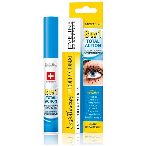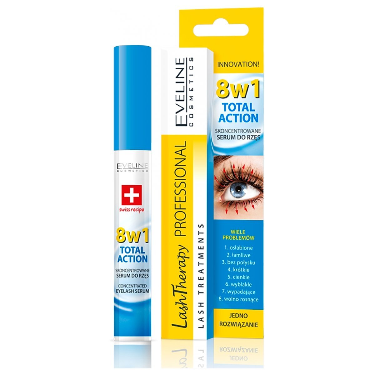Eveline Cosmetics Lash Therapy Professional 8w1 Total Action - innowacyjny produkt, który łączy w sobie właściwości serum odbudowującego, aktywatora wzrostu rzęs oraz bazy pod tusz. Intensywna pielęgnacja osłabionych i łamliwych rzęs. Serum działa w 8 obszarach, widocznie wzmacniając i poprawiając kondycję rzęs