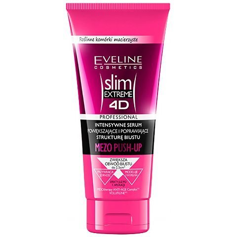 Eveline Slim Extreme 4D - intensywne serum powiększające i poprawiające strukturę biustu, które wspomaga ujędrnianie i modelowanie tej delikatnej strefy ciała. Formuła serum wzbogacona o składniki aktywne, takie jak ekstrakt z roślin, peptydy i kofeinę, stymuluje mikrokrążenie, poprawia elastyczność skóry oraz nawilża ją, zapewniając efekt wygładzenia i ujędrnienia. Regularne stosowanie serum może przyczynić się do wizualnego powiększenia biustu, poprawy jego kształtu oraz ogólnej kondycji skóry. Idealne do codziennej pielęgnacji biustu, zwłaszcza po ciąży lub utracie wagi.