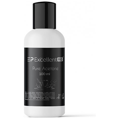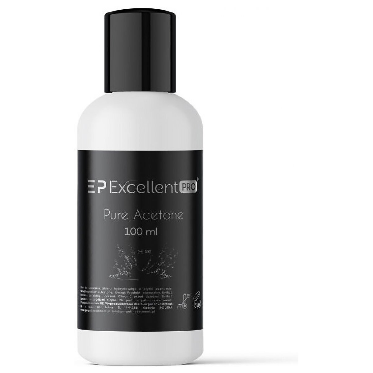 Excellent PRO Pure Acetone - to aceton 100%, bez dodatku wody oraz innych substancji zapachowych. Wysokiej jakości płyn do zdejmowania manicure hybrydowego oraz zmiękczania żelu. Świetnie sprawdzi się również do czyszczenia pędzelków usuwając pozostałości żelu lub lakieru hybrydowego.