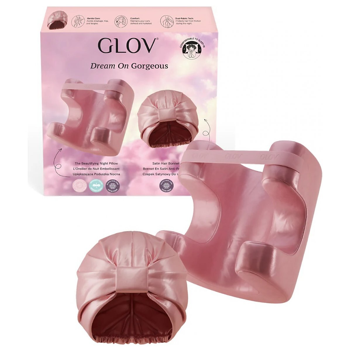 Glov Dream On Gorgeous - nocny duet dla pięknej skóry i zadbanych włosów. W zestawie znajdziesz poduszkę Sleeping Beauty z pianką memory, która minimalizuje nacisk i tarcie twarzy podczas snu, oraz miękki satynowy czepek chroniący włosy przed puszeniem, łamliwością i nocnymi odgnieceniami. Rezultat? Gładsza skóra o poranku, mniej „sleep wrinkles” i fryzura w zdecydowanie lepszej formie. Redukcja tarcia i ucisku na twarz — mniejsze ryzyko powstawania zmarszczek sennych . Ergonomiczna konstrukcja z czterema strefami snu dla osób śpiących na plecach, boku lub w różnych pozycjach. Pianka memory idealnie dopasowuje się do kształtu głowy i szyi, zapewniając stabilne podparcie. Ogranicza nocne zmiany pozycji — łatwiej utrzymać komfortowe ułożenie przez całą noc.