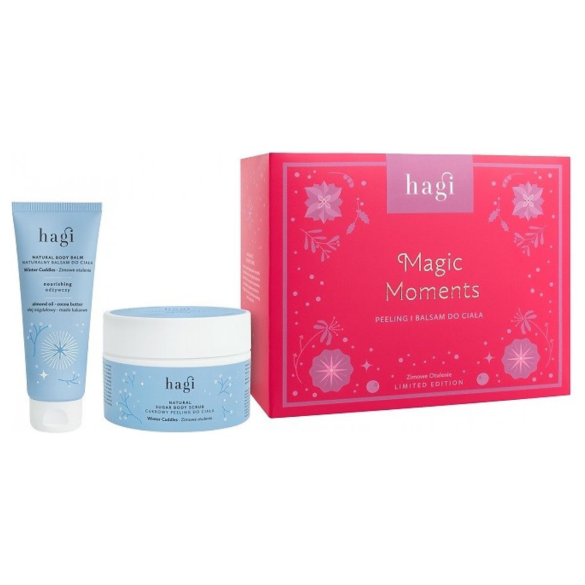 Hagi Magic Moments - marzysz o jedwabiście gładkiej, nawilżonej i promiennej skórze? Podaruj sobie chwilę przyjemności z wyjątkowym zestawem prezentowym do pielęgnacji ciała Zimowe Otulenie. Rozpocznij swój zimowy rytuał od aromatycznego peelingu cukrowego, który delikatnie złuszcza i wygładza skórę, pozostawiając ją miękką i odżywioną. Następnie otul ciało bogatym balsamem, którego kremowa konsystencja i rozgrzewający zapach cytrusów, wanilii i czekolady wprowadzą Cię w świąteczny nastrój i ukoją zmysły.