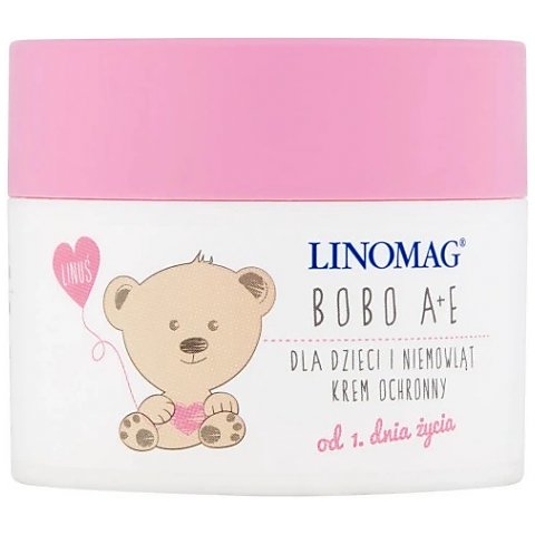 Linomag Emolienty Bobo A+E - kosmetyk łączący funkcje kremu ochronnego i kremu nawilżającego do twarzy do codziennej pielęgnacji i ochrony skóry dzieci i niemowląt. Wzbogacony olejem lnianym, witaminą A i witaminą E, tworzy niewidzialną tarczę, która chroni, nawilża i łagodzi podrażnienia. Znakomicie sprawdzi się jako krem nawilżający do twarzy i ciała, krem na suchą skórę.