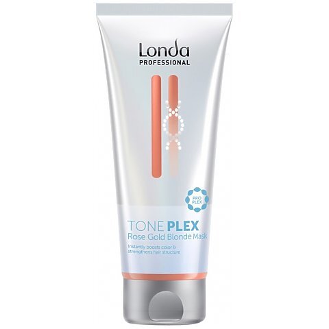 Londa Professional Toneplex mask - maska Rose Gold Blonde z intensywnymi pigmentami i technologią Proplex odświeża ciepłe odcienie blondu, nadając włosom różowozłoty odcień, jednocześnie odbudowując wiązania wewnątrz włosów. Neutralizuje zielone tony we włosach. Delikatna, przebadana dermatologicznie formuła gwarantuje wysoką jakość koloru. Technologia Proplex z kwasem maleinowym wzmacnia wewnętrzną strukturę włosa.