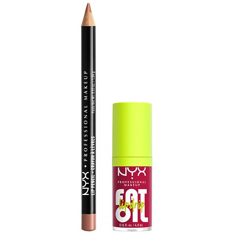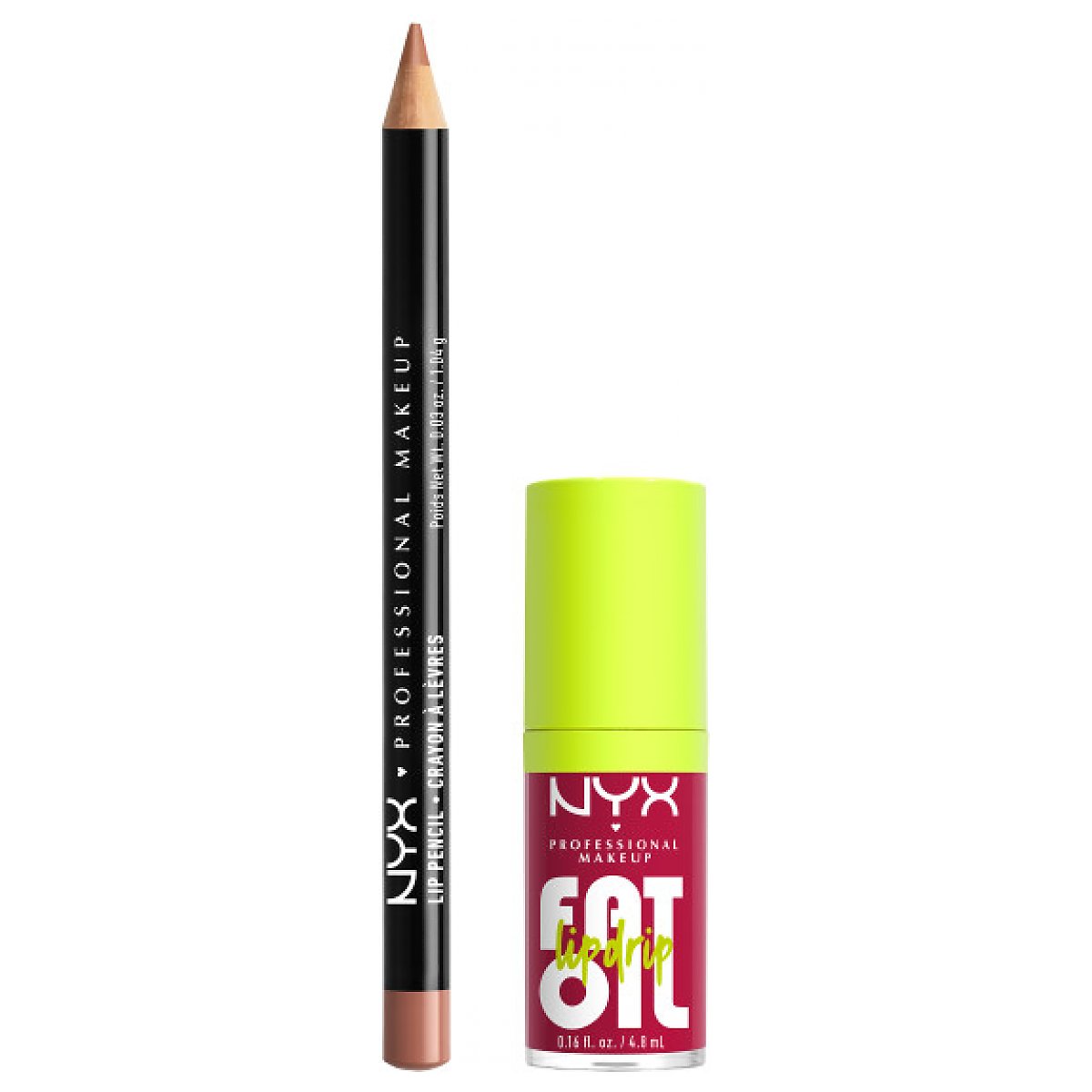 NYX Professional MakeUp Duo Kit - kredka do ust Slim Lip Pencil jej kremowa, wytrzymała formuła łatwo się nakłada i nie rozmazuje. Połącz kredkę z Fat Oil - olejkiem do ust z pigmentem, który pozostawia usta niezwykle soczyste i pełne blasku! Wzbogacony olejkiem z maliny moroszki i olejkiem z pestek malin zapewnia ochronę i nawilżenie aż do 12 godzin.