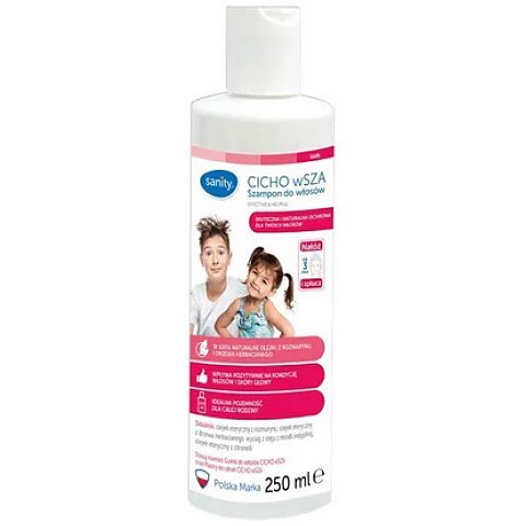 SANITY Kids CICHO wSZA - szampon do włosów to pewny środek przeciw wszawicy zarówno dla dorosłych, jak i dla dzieci powyżej 3 roku życia. Stanowi skuteczną, ale bezpieczną i naturalną ochronę dla skóry twojej głowy i włosów. Szampon na wszy CICHO wSZA zawiera naturalne składniki o sprawdzonym i udowodnionym działaniu, zalecany jest do codziennego użytku.