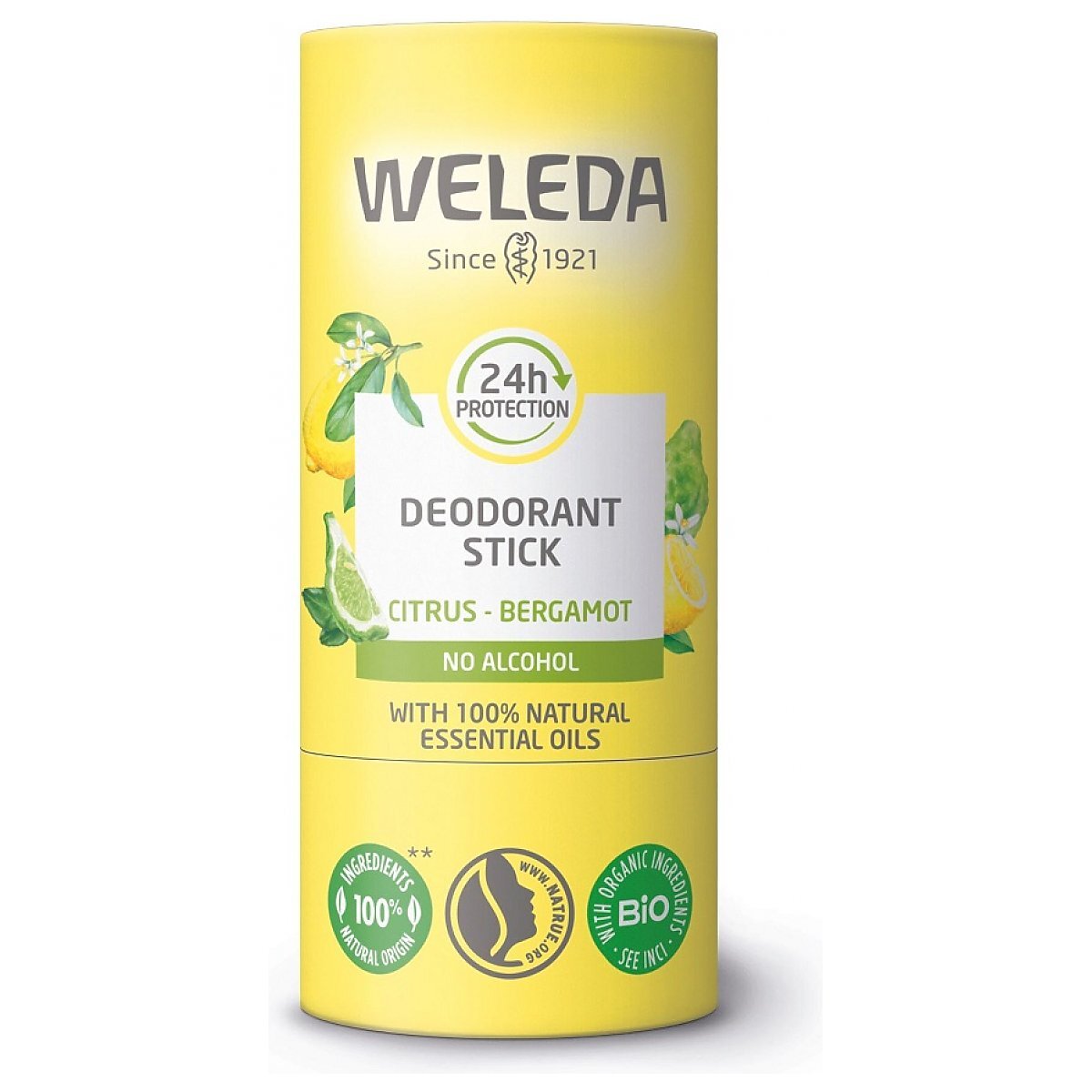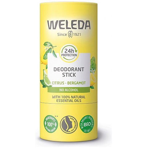Weleda - dezodorant w sztyfcie cytryna–bergamotka to w 100% naturalna formuła zapewniająca skuteczność do 24 godzin. Produkt nie zawiera alkoholu ani soli aluminium. Dzięki formie sztyftu umożliwia szybką i wygodną aplikację oraz skutecznie pomaga zapobiegać powstawaniu nieprzyjemnych zapachów, pozostawiając uczucie świeżości i lekki, energetyzujący cytrusowy aromat.</p><p>Naturalna formuła wspiera prawidłowe funkcje termoregulacyjne skóry. Dezodorant nie pozostawia plam na ubraniach i może być stosowany także na świeżo wydepilowaną skórę, dzięki brakowi alkoholu. Zawarte w nim olejki eteryczne ze skórki cytryny i bergamotki odpowiadają za przyjemny zapach, masło shea działa łagodząco, a olej słonecznikowy nawilża, odżywia i wspomaga regenerację skóry.</p><p>Produkt jest wegański, dermatologicznie testowany, a jego kartonowe opakowanie jest wygodne w użyciu i przyjazne dla środowiska.