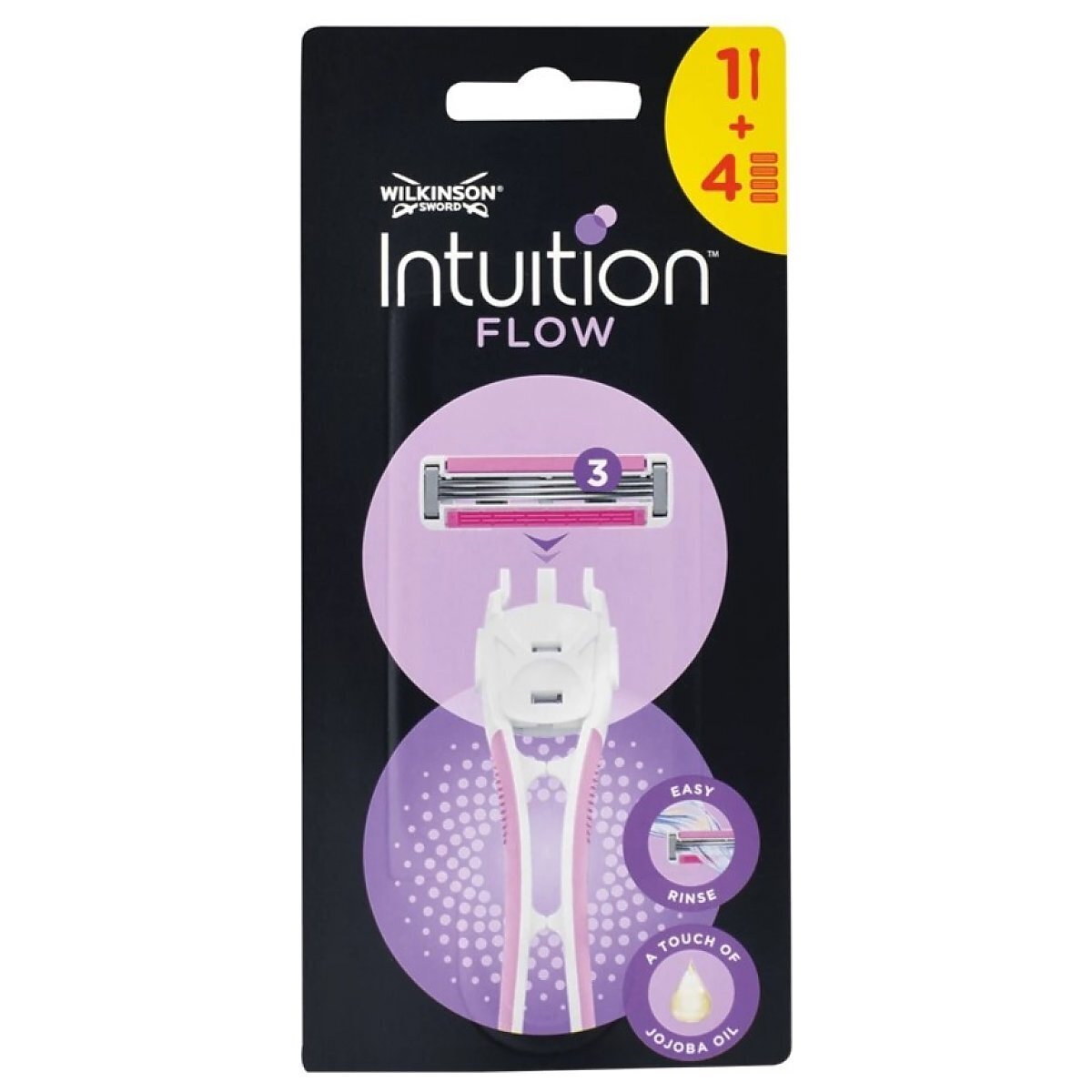 Wilkinson Intuition Flow - maszynka do golenia z 3 ostrzami i obrotową główką zapewnia dokładne i gładkie golenie. Podwójny pasek nawilżający, aby zmniejszyć podrażnienia podczas golenia<br>• System otwartych ostrzy umożliwia szybkie spłukanie. Lekka, wyprofilowana i ergonomiczna rączka zapewniająca pewny i stabilny chwyt.