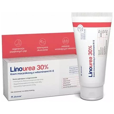 Ziołolek Linovit A+E - krem mocznikowy z witaminami A + E to wydajny kosmetyk, który po aplikacji pozostawia odpowiedniej wielkości film ochronny nie powodując uczucia nadmiernej lepkości skóry. Wyraźnie poprawia nawilżenie skóry czyniąc ją bardziej odporną na utratę wody z naskórka. Likwiduje nadmierną suchość i szorstkość skóry.